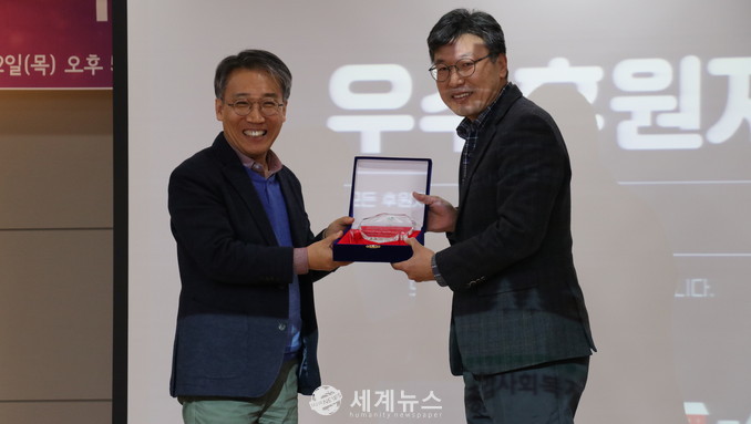 | ▲ 12일 조복현 서울에너지공사 신재생에너지본부장(오른쪽)이 유영덕 목동종합사회복지관장으로부터 감사패를 수여받고 있다. |