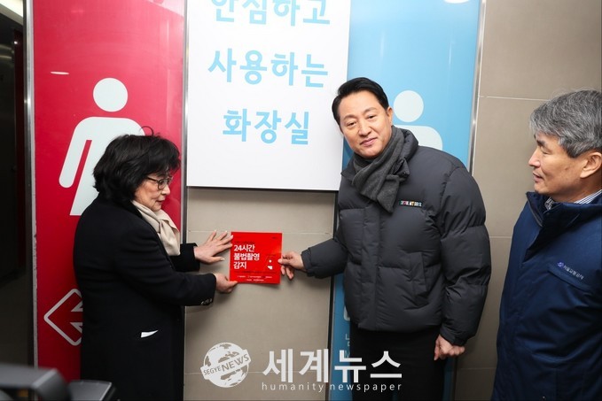 ▲ 18일 지하철 내 여성 대상 성범죄 근절 의지를 알리는 ‘지하철 여성화장실 안심 캠페인’ 행사에 참석한 오세훈(가운데) 서울시장이 백호(오른쪽) 사장이 지켜보는 가운데 "24시간 불법촬영 감지" 스티커를 붙이고 있다. 가 18일 오전 10시 30분 1호선 서울역에서 열렸다. |