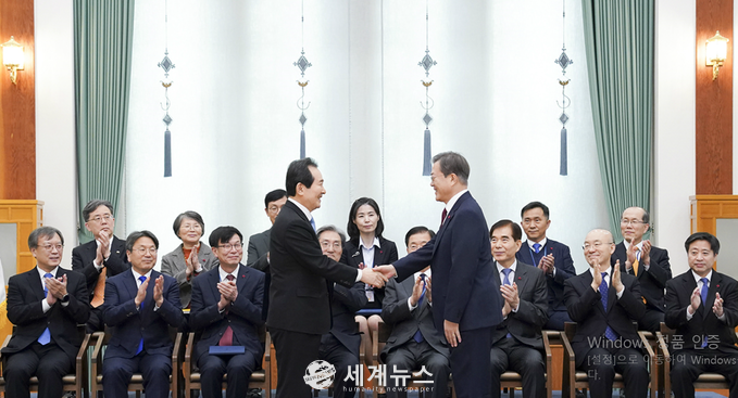[세계뉴스 탁병훈 기자] 문재인 대통령은 14일 오후 청와대 본관에서 정세균 신임 국무총리에게 임명장을 수여했다.