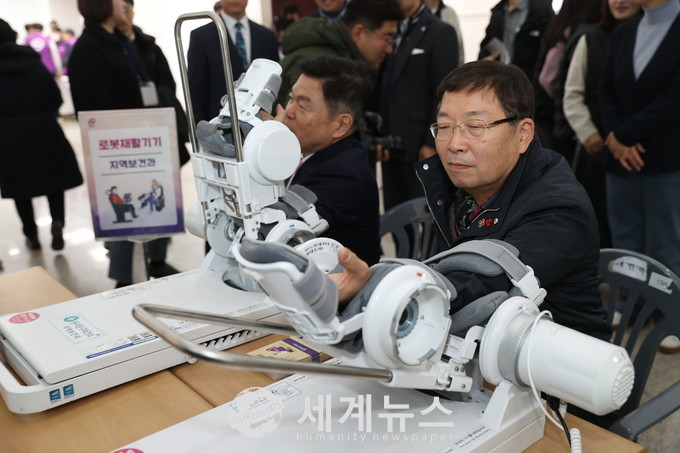 | ▲ 18일 김경호(오른쪽) 광진구청장이 로봇기기를 시연해보고 있다. |