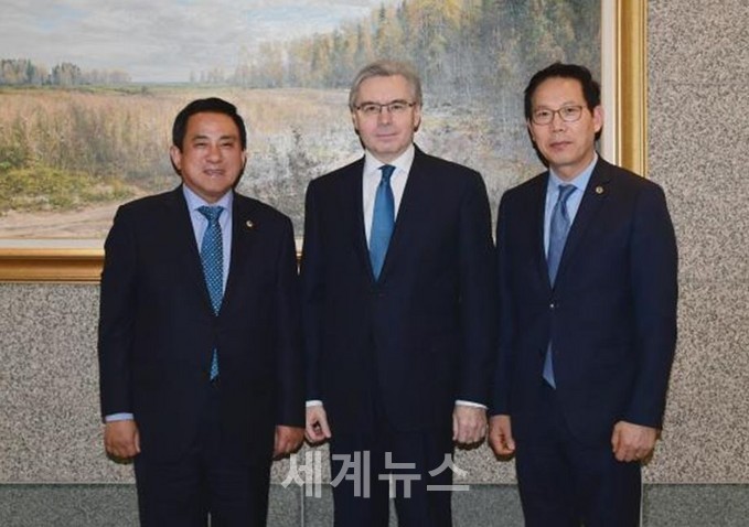 ▲ 24일 양준욱(왼쪽) 서울시의회 의장과 알렉산드르 안드례예비츠 티모닌(가운데) 주한 러시아 대와 친선교류 활성화 방안을 모색하기로 의견을 같이했다. 이 자리에는 성중기(오른쪽) 교통위 부위원장이 함께했다. © 세계뉴스 |