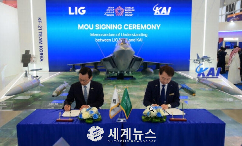 LIG넥스원은 10일(현지시간) 사우디아라비아 리야드에서 열린 ‘WDS 2026(World Defense Show)’에서 KAI와 ‘KF-21 및 FA-50용 항공무장 개발과 통합을 위한 업무협약(MOU)’을 체결했다고 11일 밝혔다. 협약식에는 신익현 LIG넥스원 대표이사와 차재병 KAI 대표이사를 비롯한 양사 주요 경영진이 참석해 전략적 파트너십을 공식화했다.