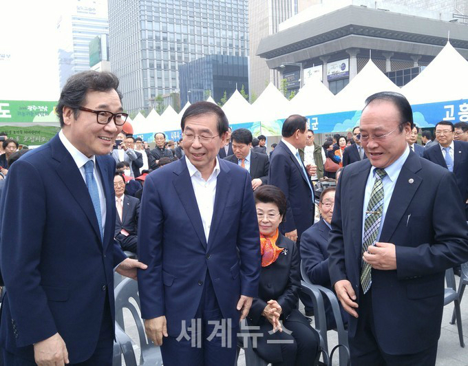 ▲ (왼쪽부터) 이낙연 전남도지사, 박원순 서울시장, 이은성 재경담양군향우회장이 인사말을 건네고 있다. © 세계뉴스 |