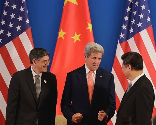 ▲ 존 케리 미국 국무장관(왼쪽 두번째)이 6일 중국 베이징에서 개막한 제8차 미중 전략경제대화에서 시진핑 중국 국가주석(오른쪽)과 대화하고 있다. <왼쪽부터 제이컵 루 미 재무장관, 케리 장관, 시진핑 주석>. © 세계뉴스 |