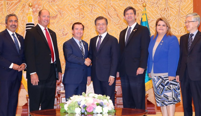 문 대통령은 청와대 접견실에서 미 의원단을 맞아 “한반도 평화와 동북아 평화를 위해서 많은 노력을 해주신 것에 감사드린다”며 “특히 북한의 계속된 핵·미사일 도발에 대해서 입법을 통해 북한에 강력한 제재와 압박을 하면서도 한편으로는 외교적인 해결의 메시지를 던지고 계셔서 감사드린다”고 말했다.