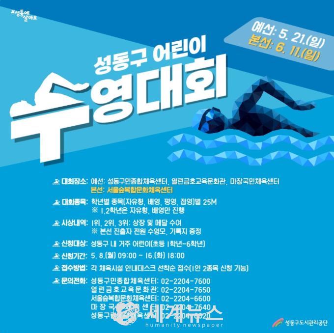 성동구 어린이 수영 저변 활성화 및 건강증진을 위해 성동구 내 거주 초등학생 및 성동구 초등학교 재학생을 대상으로 성동구어린이 수영 대회를 개최한다고 밝혔다.