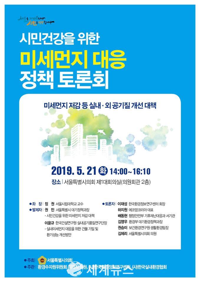 [세계뉴스] 정서영 기자 = 서울특별시의회 환경수자원위원회 미세먼지 대책 소위원회 김제리 위원장(더불어민주당·용산1)은 21일 오후2시 서울시의회 의원회관 2층 제1대회의실에서 한국정보연구센터, 한국실내환경협회와 공동주관으로 ‘시민건강을 위한 미세먼지 대응 정책 토론회’를 개최한다.