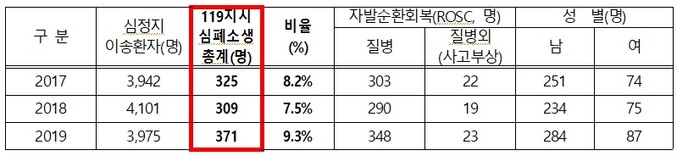 특히, 이 가운데 119 전화통화 안내를 통해 심정지 환자 응급 처치 사례는 2019년도 371건으로 전년 대비 20% 증가했다.