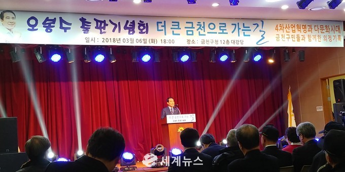 ▲ 서울 금천구청 12층 대강당에서 6일 오후 오봉수 서울시의원(더불어민주당, 금천구청장 예비후보)의 ‘더 큰 금천으로 가는 길’ 출판 기념회가 열렸다. 오 의원이 인사말을 하고 있다. © 세계뉴스 |