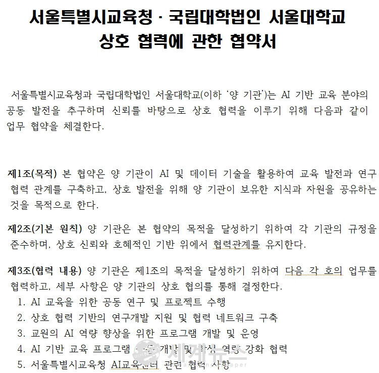[세계뉴스 = 차성민 기자] 서울시교육청과 서울대학교가 AI 교육 생태계 조성을 위한 업무 협약을 체결했다.