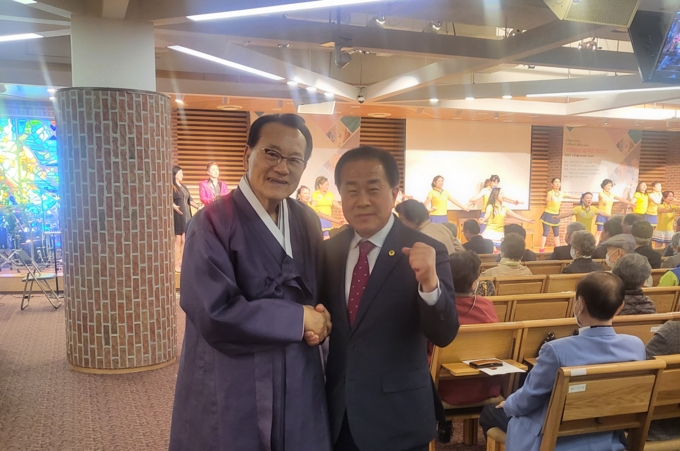 ▲ 27일 김용호(오른쪽) 서울시의회 정책위원장이 '대한민국 치매예방 국민건강댄조 강남·서초구 캠페인' 행사장에 참석하여 김호일 대한노인회 회장과 기념 촬영을 하고 있다. |