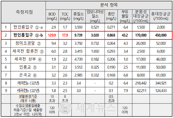 유만희 의원의 요구에 따라 서울시 보건환경연구원은 서초구와 합동으로 지난 3월 8일부터 22일까지 세곡천 상류지역 7개 지점에 대한 현장조사 및 수질검사를 실시했다. 검사 결과 세곡천 상류 헌인릉 입구 하수암거에서 고농도 생활오수가 확인됐다.