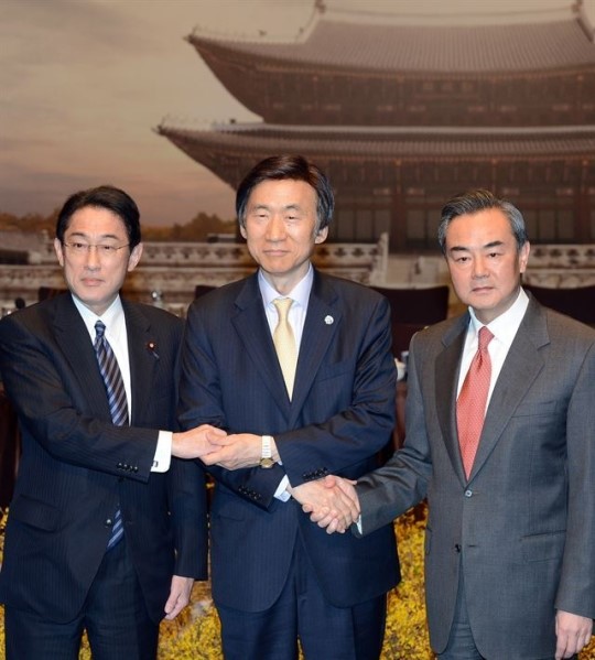 ▲ 21일 서울 중구 신라호텔에서 윤병세(가운데) 외교부 장관과 왕이(오른쪽) 중국 외교부장, 기시다 후미오 일본 외무상이 한ㆍ중ㆍ일 3국 외교장관회의에 앞서 기념촬영을 하고 있다. 사진공동취재단 © 세계뉴스 |
