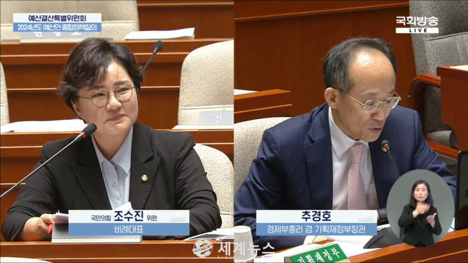 ▲ 10일 국민의힘 조수진 의원이 추경호 경제부총리에게 담양호 용수공급시설 확충을 위한 국비예산 10억원의 증액을 요청했다. |