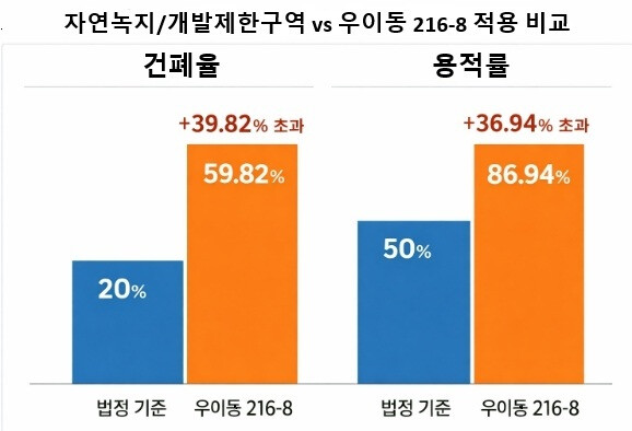 이에 대해 강북구청 건축과는 “개발제한구역 특례 규정을 적용할 경우 용적률 상한이 300%까지 가능하기 때문에 86.94%는 문제 될 것이 없다”는 설명이다.