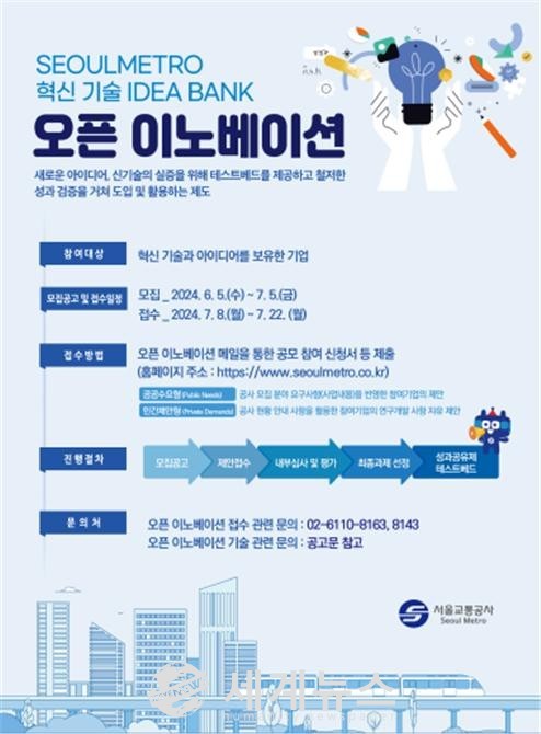[세계뉴스 차성민 기자] 서울교통공사(사장 백호)는 도시철도 현안 해결 등을 위한 다양한 혁신 아이디어를 찾고자 오픈 이노베이션 제안 접수를 8일부터 22일까지 받는다.