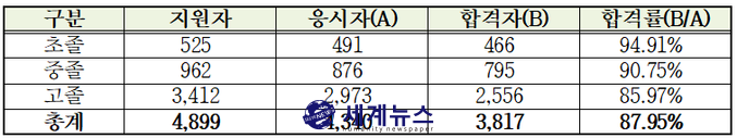 한편, 금년도 1회 검정고시는 4,340명이 응시하여 3,817명이 합격했으며 합격률은 87.95%를 보였다.