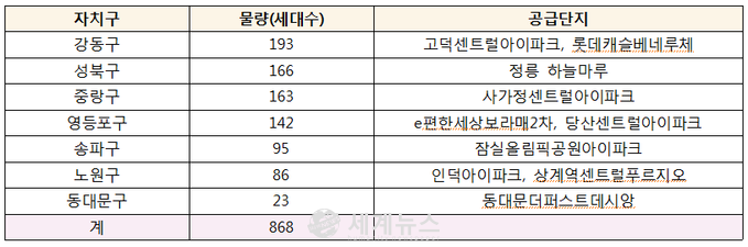 공급지역별 세대수를 보면 고덕센트럴아이파크(96세대)와 롯데캐슬베네루체(97세대)가 포함된 강동구가 193세대로 가장 많고 그 뒤를 성북구(166세대)와 중랑구(163세대)가 따른다. 이번 행복주택 전체 물량 868세대는 모두가 신규로 건축된 주택으로 공사가 직접 건설한 ‘정릉 하늘마루’(청신호 1호주택)를 제외하면 모두 서울시 재건축/재개발 매입 물량이다.