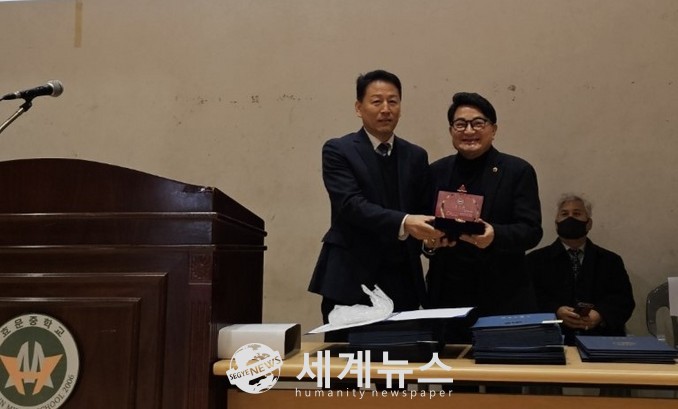 [세계뉴스 윤소라 기자] 서울시의회 홍국표 의원(국민의힘·도봉2)이 14일 도봉구 효문중학교에서 열린 제17회 졸업식에 참석해 축사를 하고 서울시의회 의장 표창을 전수하며 졸업생들의 앞날을 응원했다.