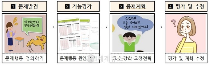 일반학교에서 시범운영한 ‘교실 속 긍정적 행동지원 프로세스’는 ① 문제행동 발견 ② 문제행동 원인 찾기 ③ 행동중재계획 수립하기 ④ 행동중재계획의 실행-평가-수정, 총 4단계로 구성된 문제행동을 지도하는 일련의 과정이다.