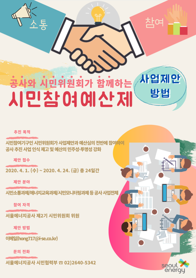 [세계뉴스 차성민 기자] 서울에너지공사(사장 김중식)는 사업예산 운영에 시민이 직접 참여하는 ‘시민참여예산제’를 실시, 사업예산 투명관리에 나선다고 3일 밝혔다.