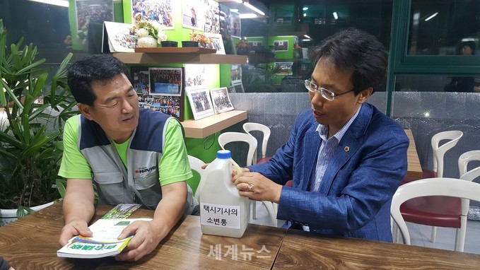 ▲ 김광수(오른쪽) 서울시의원(국민의당, 노원5)이 한 택시기사를 면담하며 택시운전대를 잡으면서 소변통까지 챙겨야 하는 현실에 대해 위로와 개선책을 제시하고 있다. © 세계뉴스 |