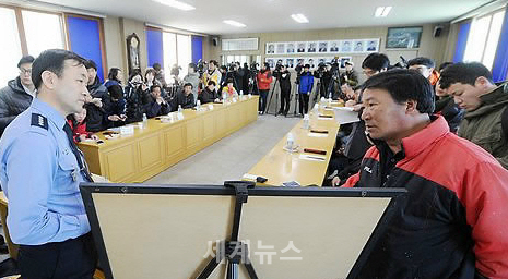 [세계뉴스 차성민 기자] 24일 인천시 옹진군 대청도 대청면사무소에서 열린 주민간담회에서 윤병두 인천해양경비안전서장이 불법조업 중국어선에 대한 대책을 주민들과 논의하고 있다.