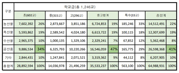 서울시의회 교육위원회 이종태 의원(국민의힘, 강동2)이 서울시교육청 학교급식 식재료 계약현황을 받아 분석한 결과, 전체 식재료 중에서 공산품이 차지하는 비율이 2013년 33%에서 2022년 41%로 8%p나 높아졌고, 특히 중·고등학교의 경우 35%에서 47%로 12%p나 높아져 불균형 상태가 더욱 심각한 것으로 나타났다. 한편 중·고등학교의 공산품 사용 비중이 비정상적으로 높은데 반하여 수산물의 비중은 10년 사이에 17%에서 9%p나 줄어들어 8%에 불과한 것으로 나타났다.