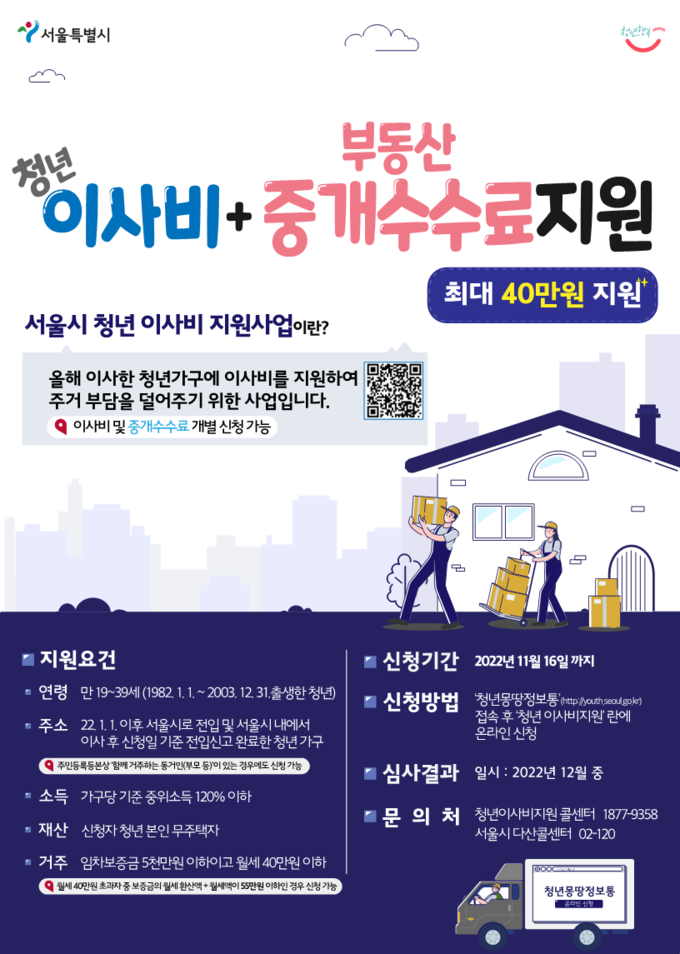 이 사업은 서울시가 청년가구에게 이사비를 지원하여 주거 부담을 덜어주기 위한 정책이다. 지원 대상은 연령 만19세~39세의 청년이다. 올해 서울시로 전입하거나 서울시 내에서 이사 후 신청일 기준 전입신고를 완료한 청년에게 최대 40만원 한도 내의 실비가 지원된다. 신청액이 40만원을 넘지 않을 경우 중개수수료를 추가 신청해 지원 받을 수 있다.