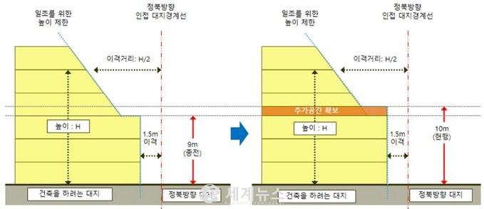 ▲ 건축 조례 개정 전(좌), 후(우) 일조권 사선제한 비교. |