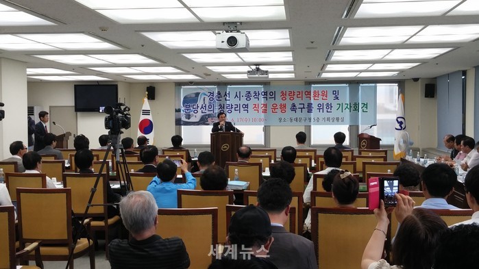 ▲17일 동대문구청 5층 기획상황실에서 안규백 국회의원이 '경춘선, 분당선 청량리역 직결 (시.종착) 운행'을 국토교통부와 코레일에 강력히 촉구하고 있다. © 세계뉴스 |