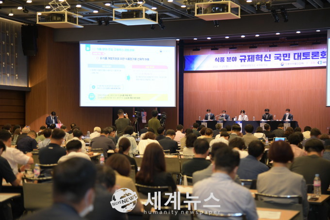 [세계뉴스 전승원 기자] 식품의약품안전처(처장 오유경)는 지난25일 대한상공회의소(서울 중구 소재)에서 식품, 수입식품, 축산물, 위생용품 등 식품 분야 관련 업체‧협회‧학계‧소비자단체가 함께하는 ‘식품 분야 규제혁신 국민 대토론회’를 개최했다.