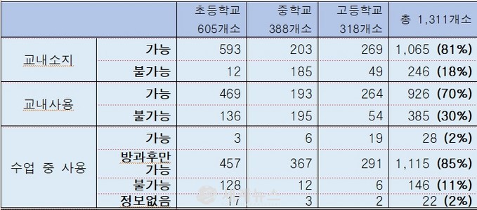 휴대폰 소지가 가능하면서 규제가 없는 학교는 초등학교 469곳, 중학교 193곳, 고등학교 264곳으로 전체의 70%에 달했다.