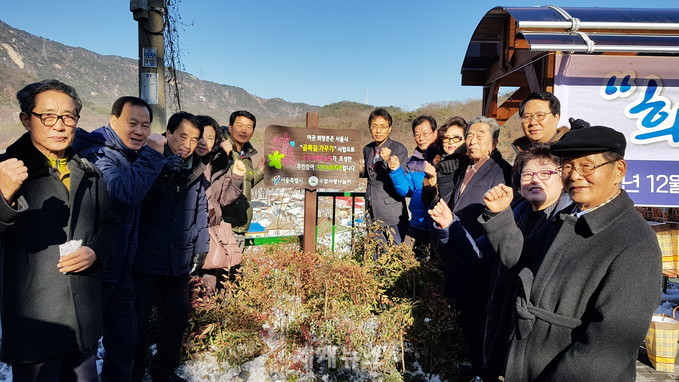 ▲ '희망마을' 현판식. 김광수 서울시의원(국민의당, 노원5)은 6개월간 지역 의정활동을 통해 기적을 이룬 희망마을과 별빛마을 소개하는 '동네 숲 가꾸기' 준공식을 지난 19일 가졌다. © 세계뉴스 |