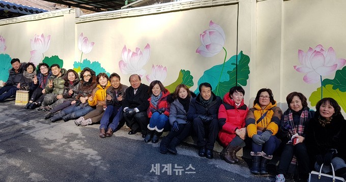 ▲ 봉사단원들이 벽화앞에서 기념촬영을 하고 있는 모습. 김광수 서울시의원(국민의당, 노원5)은 6개월간 지역 의정활동을 통해 기적을 이룬 희망마을과 별빛마을 소개하는 '동네 숲 가꾸기' 준공식을 지난 19일 가졌다. © 세계뉴스 |