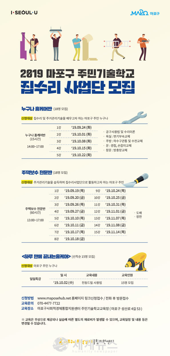 [세계뉴스 조홍식 기자] 마포구(구청장 유동균)는 오는 9월 19일부터 11월 14일까지 지역일자리 창출과 지역경제 활성화를 위한 ‘2019 마포구 주민기술학교 집수리 사업단’을 운영한다고 밝혔다.
