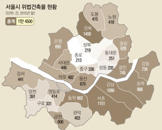 문제는 지난해 말 기준으로 서울시에 신고된 위법 건축물이 1만 4500건에 이른다는 점이다. 북한산 계곡 부근에 무허가 음식점이 많은 강북구가 1408건으로 가장 많았고, 임대료가 높고 상가가 많은 서초구(1151건)와 강남구(1080건)가 뒤를 이었다.