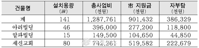 | ▲ 시범대상 건물의 태양광 설치용량 및 지원금. |