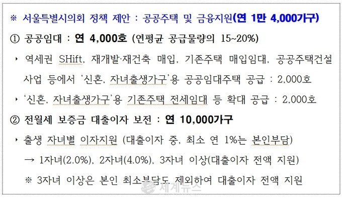 서울시의회는 ①공공임대의 경우, 신혼 및 자녀 출생 예정 가구(또는 최근 1년 이내 자녀 출생 가구)를 대상으로 연평균 공급물량의 약 15~20% 수준에 해당되는 연 4,000호가 우선 배정되도록 개선하고, ②금융지원(이자지원)의 경우에는 연 10,000가구를 지원하되 3자녀 이상은 최소부담(1%) 없이 대출이자 전액을 지원하는 안을 제시했다.