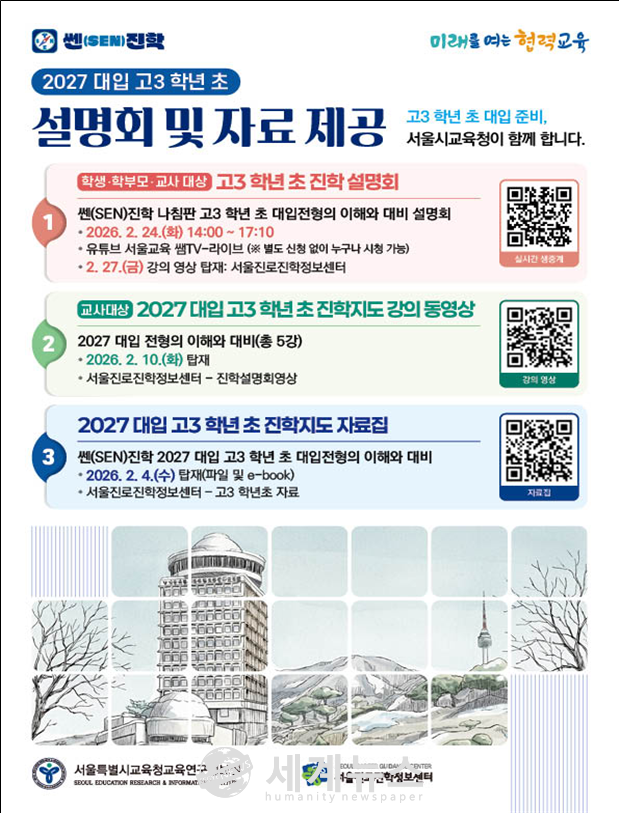 [세계뉴스 = 조홍식 기자] 서울특별시교육청 산하 서울시교육청교육연구정보원이 예비 고3 수험생과 학부모, 교사가 2027학년도 대학입시를 체계적으로 준비할 수 있도록 맞춤형 진학 지원을 강화한다. 이 지원은 진학지도 자료집 제공, 주제별 진학지도 동영상 제작, 진학 설명회 개최로 구성된다.