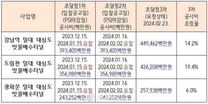 남 부의장은 강남역, 도림천, 광화문 일대 대심도 빗물배수터널 사업이 2022년 서울시 홍수 피해로 추진의 급물살을 탔고 입찰공고를 냈지만 공사비가 부족하다고 판단한 건설사들이 참여하지 않아 시간만 보내고 있다며 안타까움을 토로했다.