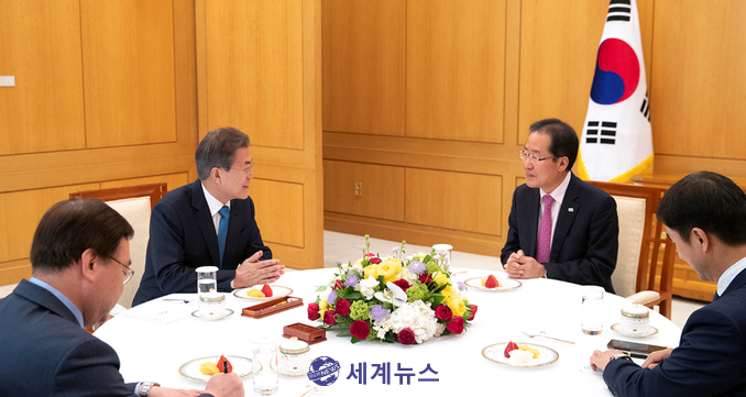 [세계뉴스] 탁병훈 기자 = 문재인 대통령은 13일 홍준표 자유한국당 대표와 첫 단독회동을 갖고 남북한 정상회담과 관련해 초당적 협력을 당부했다. 이날 문 대통령과 홍 대표는 1시간20분 동안 단독 회동을 가졌다.