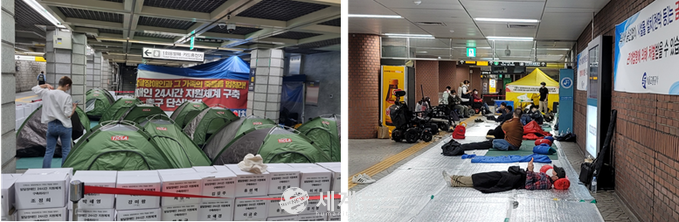 ▲ 시청역・경복궁역에서 노숙을 시도하며 텐트를 쳐놓고 있는 모습과 역사 내 공간을 장악한 전장연 시위 모습. |
