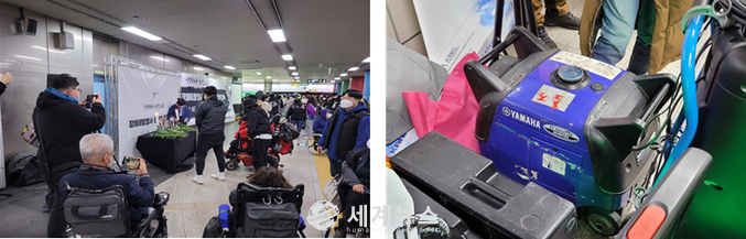 ▲ 전장연이 승강장에서 촛불을 피우는 모습과 노숙 시도시 반입했던 경유 비상발전기를 대기 시켜놓은 모습. |