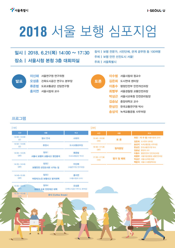 서울로 7017, 차 없는 거리 등의 보행친화사업을 역점 추진 중인 서울시는 안전이 담보되는 보행친화도시로 발돋움하기 위해, 이번 심포지엄에서 전문가들의 연구결과와 행정 노하우를 공유하고 고령인구 증가, 스몸비족의 등장 등 교통환경 변화에 걸맞은 실효성 있는 보행정책을 논의할 계획이다.