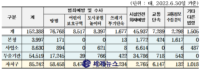 디지털정책관 제출 자료에 의하면, 2022년 6월 기준 서울시 CCTV는 서울시 운영 67,146대, 자치구 운영 85,242대 등 총 152,388대다.