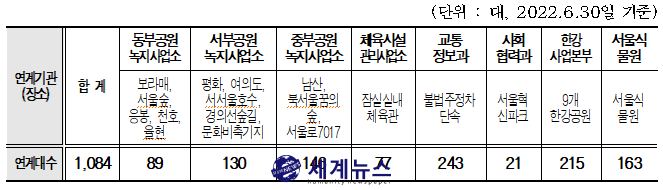 이 중 스마트서울 CCTV 안전센터에 연계된 CCTV는 9개 한강공원을 비롯한 공원·녹지와 교통정보과의 불법주정차 단속 CCTV 등 1,084개에 불과하다.