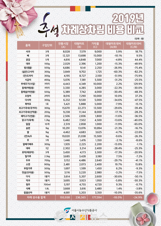 [세계뉴스] 조홍식 기자 = 서울시농수산식품공사(사장 김경호)는 추석 명절을 앞두고 서울시내 25개구 전통시장, 대형마트 및 가락시장 내 가락몰 등 총 76곳을 대상으로 2019년 추석 차례상차림 비용을 조사.발표했다.