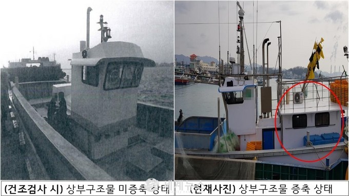 이들 어선 중 9.77톤 어선은 실측 조사결과 상부 구조물이 바뀌었고, 선체 길이는 최대 2.6미터 늘어나는 등 17톤으로 불법 건조가 된 것으로 확인됐다.