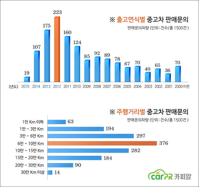 주행거리별로 보면 1만Km 이하 63대, 1~3만Km 194대, 3만~6만Km 297대, 6만~10만Km 376대, 10만~15만Km 282대, 15만~20만Km 184대, 20만~30만Km 90대, 30만Km 이상 14대로 10만 Km 내 판매의사가 62%로 반영 되었으며 이들의 평균주행거리는 96,0000Km 정도가 된다.